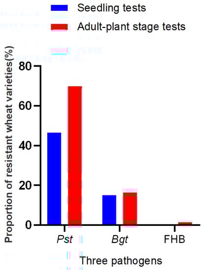 Wheat stripe rust, also known as yellow rust, caused by Puccinia striiformis f. sp. tritici (Pst), is a major threat to most wheat growing areas in the world, especially in China. Severe national-wide stripe rust epidemics in 1950, 1964, 1990, 2002, and 2017 caused production losses of 6.0, 3.2, 1.8, 1.3, and 1.5 million metric tons, respectively [,,]. In addition, the pandemic of wheat stripe rust in 2020 was the highest in the past decade, which has once again sounded an alarm for us []. Powdery mildew, caused by the pathogen Blumeria graminis (DC.) Speer f. sp. tritici emend. É. J. Marchal (Bgt), can cause 30–40% yield losses in epidemic years [,]. In recent years, the area affected by powdery mildew in China is about 6–8 million hectares each year []. Fusarium head blight, also known as wheat scab, mainly caused by Fusarium graminearum Schwabe, occurs directly on wheat spikes and cause both grain yield losses and food toxins, which is imposing health threats to humans and livestock. Chemical controls have been proven to be an effective way for these three wheat diseases, but usually with additional cost and detrimental impact on the environment. In contrast, host resistance has been proposed as an effective and environmentally friendly measure to control the diseases. Therefore, it is necessary to explore wheat germplasm resources to identify genes resistant to the three important wheat diseases [].