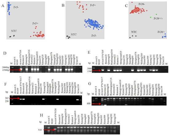 Electrophoretogram and genotyping data of different markers. (A,B), identification of Yr5 resistance gene using KASP makers; (D,E), identification of Yr9; (F,G), identification of Yr17; (C,H), identification of Yr26. Yr5+/Yr26+, Yr5−/Yr26−, indicating presence/absence of Yr5/Yr26 in the tested entries for the horizontal and vertical axis, respectively. NTC, non-template control.