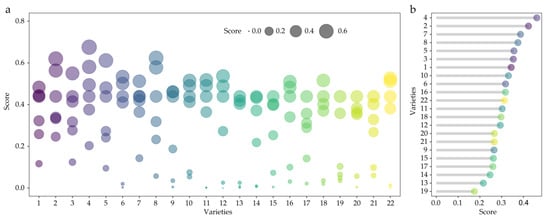 Comprehensive evaluation of the autotoxic effect of 22 alfalfa varieties exposed to six leaf extract concentrations. (a) Under six concentrations, the seven germination indexes of the 22 varieties are relative to the comprehensive score of CK. 1–22 represent twenty-two alfalfa varieties, and each circle represents each treatment concentration. (b) Comprehensive score ranking of 22 varieties.