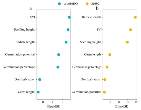 In this study, the random forest model was used to evaluate variable importance. The prediction accuracy of the allelopathic comprehensive effect index for 3105C and WL656HQ were 96.9% and 65.2%, respectively (Figure 2). The ranks of variables affecting the comprehensive allelopathic index of WL656HQ were SVI, seedling height, radicle length, GP, germination percentage, dry fresh ratio, and germ length. The SVI was the main influence index with an importance of 9.5% (Figure 2a). The ranks for 3105C were radicle length, SVI, seedling height, germ length, germination percentage, dry fresh ratio, GP and radicle length was the main influence index, and the degree of importance was 10.8% (Figure 2b).