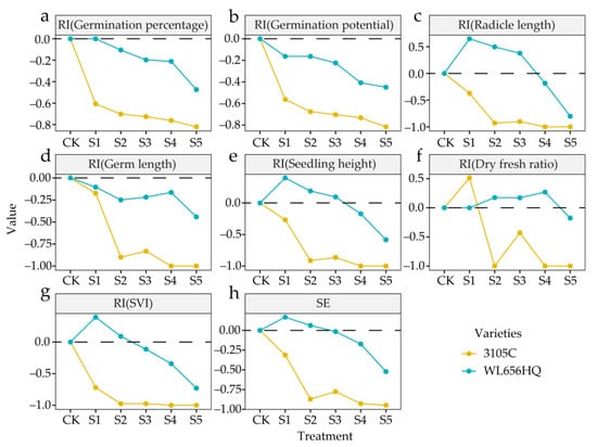 The allelopathy index (radicle length, seedling height, SVI) and SE of WL656HQ showed stimulatory effects at low concentrations (S1 and S2), and inhibitory effects at high concentrations (S3, S4, and S5; Figure 3). In contrast, the allelopathy index (germination percentage, GP, radicle length, germ length, seedling height and SVI) and SE of 3105C at all concentrations showed inhibitory effects (Figure 3c–h).