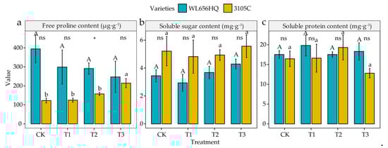 Effects of autotoxicity on proline, soluble sugar and soluble protein content of alfalfa. The blue in the box plot represents the variety WL656HQ; the yellow represents the variety 3105C. The different lowercase and uppercase letters represent the significance of 3105C and WL656HQ at different concentrations. * Indicates the difference between the two varieties. The value p ≤ 0.05 is marked as *. The value p ≥ 0.05 is marked as ns. (a) Proline content; (b) soluble sugar content; (c) soluble protein content.