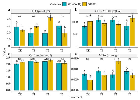 The H2O2 content of 3105C was significantly higher than that of WL656HQ at T2. With extract treatment, the H2O2 contents of WL656HQ deceased slightly compared to CK, but 3105C had a significantly higher value compared to WL656HQ at T2. In addition, the H2O2 content of 3105C at T2 was significantly higher than CK (Figure 6a). The OH• content was higher for 3105C than WL656HQ at T1 and T3. WL656HQ showed the highest OH• content for the T1 treatment, and the lowest OH• value with the T3 treatment. The OH• content of 3105C first decreased, then increased for T3 (Figure 6b). The O2•− content of 3105C was higher than that of WL656HQ at T2, but not significant. For WL656HQ, the levels of O2•− increased significantly under T1 and T2 compared to CK, (Figure 6c). The MDA content of 3105C was significantly higher than that of WL656HQ at T2. For 3105C, we observed a significant peak value of MDA content at T2 compared to CK (Figure 6d).