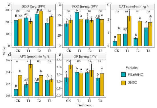 Effect of autotoxicity on antioxidant enzyme activities and antioxidant contents of alfalfa. The blue in the box plot represents the variety WL656HQ; the yellow represents the variety 3105C. The different lowercase and uppercase letters represent the significance of 3105C and WL656HQ at different concentrations. * Indicates the difference between the two varieties. The value p ≤ 0.05 is marked as *. The value p ≤ 0.01 is marked as **. The value p ≤ 0.001 is marked as ***. The value p > 0.05 is marked as ns. (a) SOD; (b) POD; (c) CAT; (d) APX; (e) GR.