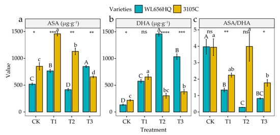 The ASA content of 3105C was significantly higher than WL656HQ at T1, T2 and T3. With increasing concentrations, the ASA level in the leaves of WL656HQ at T2 decreased significantly, which was significantly lower than that of CK and T1 (Figure 8a). The DHA content of WL656HQ at T2 was significantly higher than that of CK (Figure 8b). Among them, the ASA content and the DHA content of 3105C first increased then decreased with increasing extract concentrations. The AsA contents of WL656HQ and 3105C showed a declining trend, while the DHA content showed a gradually increasing trend. For WL656HQ and 3105C, the ratios of ASA/DHA significantly decreased under T1 and T3 compared to CK, but the AsA/DHA ratio of 3105C was higher than WL656HQ during T1 and T3 (Figure 8c).