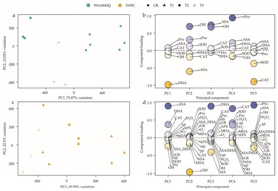 The PCA model was used to compare the treatment and control group, and to test which factors contribute to the observable differences caused by the different treatment concentrations (Figure 9). For WL656HQ, the PCA plot showed that PC1 could separate CK, T1, T2, and T3 well, with the explanation degree accounting for 76% of the total variation (Figure 9a). The indicators with the largest positive and negative contribution under PC1 were Pro and DHA, respectively (Figure 9b). For 3105C, the PCA plot showed that the four groups were well separated by PC1, which explained 66% of the total variation (Figure 9c). The indicator with the largest positive contribution under PC1 was ASA, and the indicator with the largest negative contribution was OH• (Figure 9d).