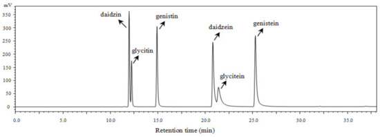 Previous studies reported that black soybean products are rich in isoflavones that contributed to their bioactivity, such as antioxidant activity. Thus, the six main isoflavones (i.e., genistin, genistein, glycitin, glycitein, daidzin, and daidzein) presented in BS and FBS were analyzed by using high-performance liquid chromatography (Shimadzu LC-20AT, Kyoto, Japan). The collected extracts (which obtained in Part 2.8.1) were filtered through a 0.22 µm syringe filter, and then 20 µL of the sample was injected into an Agilent C18 reverse-phase column (ZORBAX SB-C18, 4.6 × 250 mm, 5 μm particle size) and maintained at 30 °C. Gradient elution was performed using a mixture of acetonitrile (eluent B) and deionized water (eluent A) at 0.8 mL/min following the gradient elution program as follows: beginning with 10% B at 0 min, then linearly ramped to 20% B over 3 min, 20–25% B in 5 min. After that, eluent B increased to 60% by linear gradient within 22 min, eluent B linearly ramped to 100% over 5 min and maintained for 2 min, and finally, eluent B linearly return to 10% in 1 min. The wavelength was monitored at 254 nm with a Shimadzu SPD-20A Prominence UV-Visible detector (Shimadzu, Kyoto, Japan). The UV spectra and retention times of those authentic standards were applied to the identification and quantification of the isoflavones [10,13,31]. The isoflavones content of BS and FBS were presented as µg/g DW.