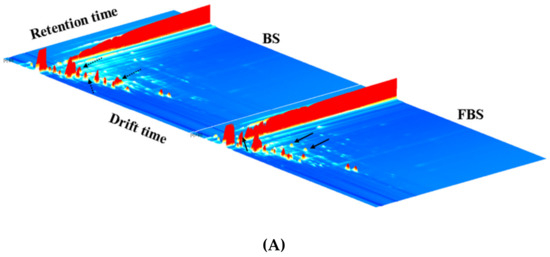 Analyses of VOCs were carried out on an advanced FlavourSpec instrument of GC-IMS (G.A.S., Dortmund, Germany) that using an Agilent 490 gas chromatograph (Agilent Technologies, Wilmington, DE, USA). Tritium (3H) was used as the ionization source of the IMS. An auto-sampler (CTC Analytics AG, Zwingen, Switzerland) with a heated gas-tight injector and a headspace sampling unit was equipped on this device that was used in the following experiment. For the analysis, two grams of lyophilized FBS or BS powder was weighed and transferred into a headspace bottle (20 mL) and kept for 15 min at 60 °C with an incubation speed of 500 rpm. Subsequently, the headspace (300 μL) was sampled and automatically injected into the injector by a heated syringe (65 °C) under splitless injection mode. The VOCs were separated in an MXT-5 capillary column (15 m × 0.53 mm ID, 1 µm) with a column temperature of 60 °C and the drift tube temperature maintained at 45 °C. High-purity nitrogen was applied as sample carrier gas and flow programmed as follows: starting at 2 mL/min and maintained for 2 min, then gradually increased to 100 mL/min during the remaining 18 min. The 3H ionization source in an ionization chamber was applied to ionize the compounds prior to detection and ionization depending on the concentration and chemical nature of the VOCs that produce protonated monomers or proton-bound dimmers ions. Subsequently, the resulting ions were driven into a 9.8 cm in length drift tube and performed at a stable temperature of 45 °C and voltage of 5 kV. The flow of drift gas (N2) was maintained at 150 mL/min. An average of 16 scans was collected in each spectrum with a 30 ms repetition rate. All analyses for the VOCs were carried out in triplicate. The N-ketones C4-C9 were applied as external references (Beijing Sinopharm Chemical Reagent Co., Ltd., Beijing, China) to calculate the retention index (RI) of the VOCs. Identification of the detected VOCs was based on a comparison of drift time (RIP relative) and retention index (RI) with that of the standard in the library database of GC-IMS supplied by G.A.S. (Dortmund, Germany). Quantitative analysis (intensities) of VOCs was conducted according to previously reported by Lv et al. [34], who used the Gallery Plot analysis (v.1.0.7, G.A.S.) to select the signal peak and calculated the peak height.