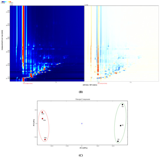 The result normalized the position of the ion migration time and the reactive ion peak (RIP), and all the headspace compounds of BS and FBS could be reflected in the whole 2D spectrum [57]. The signal intensity of the VOCs could be indicated by the color. The darker the color, the stronger the intensity [57]. White implies a lower intensity, whereas red indicates a higher intensity. Furthermore, differential comparison mode was also performed to illustrate the different VOCs between BS and FBS, as marked in Figure 4B. The spectrum of FBS was obtained by deducting the control spectral background (BS was used as a reference), in which the blue dot area suggested that the content was lower in comparison to that of the control, whereas the red dot area indicated the content was higher compared with that of the control. It was obviously observed that the content of VOCs of black soybeans notably changed by fermentation, which could also be supported by the PCA result (Figure 4C) that established by the VOCs signal intensity. It was observed that BS and FBS were well separated in the distribution plot, implying that the VOCs of BS and FBS exhibited substantially different. This methodology had been widely used in the food research field, such as identification and classification analysis of different fruit flavor compounds, fruit processing, fermentation of fruit and vegetable, as well as the other aspects [58,59]. The results revealed that some flavor compounds varied significantly throughout the fermentation processes, and others did not show distinct changes. SSF of black soybean with E. cristatum remarkably contributed to the alteration of VOCs, which might be indispensable for the unique flavor of the produced fermented products.