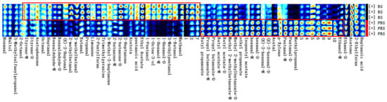 Furthermore, the compounds were characterized based on a comparison of drift time (RIP relative) and retention index (RI). A total of 66 volatile substances were observed in FBS and BS. Among them, 56 VOCs were successfully identified from the GC-IMS library database, as displayed in Table 7 and revealed in Supplementary Figure S2. It was noted that some of the certain compounds had produced various signals or spots (dimer or monomer) as a result of their different concentrations, similar to a previous report [57]. The identified VOCs belonged to several chemical families; specifically, there were 19 aldehydes, 11 alcohols, 10 esters, 3 hydrocarbons, 6 ketones, 2 acids, 3 heterocyclics, 1 phenol, and 1 terpenoid (Table 7). This result coincides with previous studies that reported that aldehydes, alcohols, and esters were the main volatile compounds for the bean products [7,60]. However, we found that the concentrations of these main VOCs were greatly influenced by fermentation with E. cristatum. Among them, it could be seen from Table 7 that the intensities of alcohols (3-methylsulfanylpropanol, ethanol-M), aldehydes (hexanal-M, hexanal-D, acetal, pentanal-M, pentanal-D, Methylpropanal), esters (butyl propanoate, propyl butanoate-M, butyl acetate-M, methyl 2-methylbutanoate-M, ethyl propanoate) significantly increased by fermentation. Compared with those detected in BS, the intensities of seven alcohols, nine aldehydes, four ketones remarkably decreased. The findings demonstrated that FBS displayed accepted flavor compounds, and E. cristatum used for fermentation of black soybeans achieved higher levels of esters. Microorganisms used for fermentation led to an increase in ester levels has also been observed by other researchers. Esters are generally considered as one of the most important volatile compounds that contributing to the flavor of food products [61]. Previous studies have verified that the esterification of alcohol is one of the sources of esters. Our present study revealed in Table 7 that most alcohols significantly decreased whereas esters greatly increased might possibility due to the esterification of alcohols during SSF. Some esters might be synthesized by microorganisms under the action of acetyltransferase that could use alcohol as the substrate [62]. GC-IMS fingerprint profiles of VOCs were analyzed to more directly clarify the different substances of BS and FBS, and the result is presented in Figure 5. All the signal peaks of each sample displayed in each row while each column indicated the same compounds in all the studied samples, and the color of each square suggested the content of VOCs. It was noted that the volatile compounds of BS and FBS are greatly different. With respect to other volatile constituents, it was found that only one phenol (maltol), two acids (pentanoic acid, heptanoic acid), three heterocyclics (2-pentylfuran, trimethylpyrazine, 2-ethylfuran) were detected from BS and FBS, and minor differences for these volatile constituents were recorded during fermentation. However, the content of limonene in FBS was at a low level, suggesting that fermentation facilitated its metabolism or transformation. These results confirmed that SSF with E. cristatum greatly influenced the volatile organic compounds of black soybeans. Thus, the GC-IMS data from the current study provided useful information and could be considered as an effective technique for the characterization of aroma profile and characteristic volatile organic compounds during legume fermentation. All of these obtained data would support and provide novel insights into the development of new fermented black soybean products in the future. Additionally, as can be seen from Figure 5, some VOCs in BS and FBS have not yet been identified but varied greatly, such as “1”, “2”, etc., which would be studied in our group in the future.