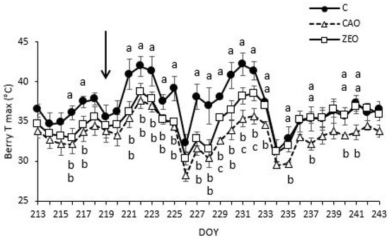 Trend of berry temperature (berry Tmax°C) measured using thermo probes in August 2019. The values are presented as mean ± standard error (SE) (n = 8 per treatment). Different letters indicate significant differences between treatments according to the Tukey test (p ≤ 0.05). The arrow indicates the date of the second treatment with the mineral particles.