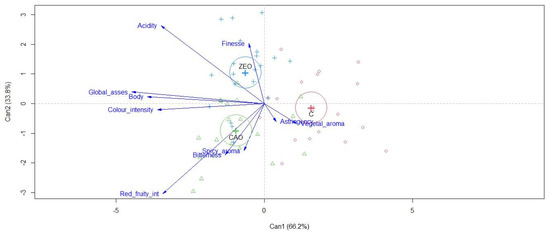 CDA on the sensory traits of Sangiovese wines obtained from each treatments showed that canonical function 1 (Can 1, on x axe) represents the 66.2% of the variability while the canonical function 2 (Can 2, on y axe) represents only 33.8% (Figure 3). As reported in Figure 3, the centroid for C was located positively along Can 1 and negatively along Can 2. The centroid for CAO was located negatively along both Can 1 and Can 2. In contrast, the centroid of ZEO was located negatively along Can 1 and positively along Can 2.