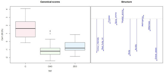 Boxplot of canonical scores (Can 1) and a vector diagram showing the magnitude of structure coefficients related to the sensory traits of Sangiovese wines obtained from kaolin (CAO) and chabasite-rich zeolitite (ZEO) treatments or the control (C) vines in 2020.