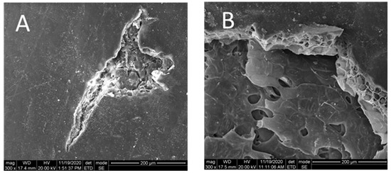 Ultra-microstructure of pomegranate peel by scanning electron microscope (SEM; magnification 300×). (A) A micro-crack in pomegranate peel; (B) A macro-crack in pomegranate peel.