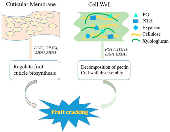 Xylologlucan endotransglucosylase/hydrolase (XTH) is an enzyme with xyloglucan molecular transferase activity or xyloglucan β-1,4 glycosidic bond hydrolysis activity, which has xyloglucan endotransglycosidase (XET) activity and xyloglucan endohydrolase (XEH) activity [86], which play an important role in regulating cell wall elongation and skin softening [87,88,89,90]. The genes related to fruit ripening found in tomato and apple are SlXTH5, SlXTH8, MdXTH2, MdXTH10, MdXTH11 [91,92]. As for the relationship between XET genes and fruit cracking, Lu et al. [93] found that the different accumulation of LcXET1 in the peel and flesh tissues of the cracking-susceptible variety ‘Nuomici’ and the cracking-resistant variety ‘Huaizhi’ was closely related to fruit cracking, and found that NAA treatment of ‘Nuomici’ litchi fruit could increase the accumulation of LcXET1 mRNA in its peel, thus reducing fruit cracking. A schematic diagram of the fruit cracking associated with the cuticle membrane and cell wall is shown in Figure 2.