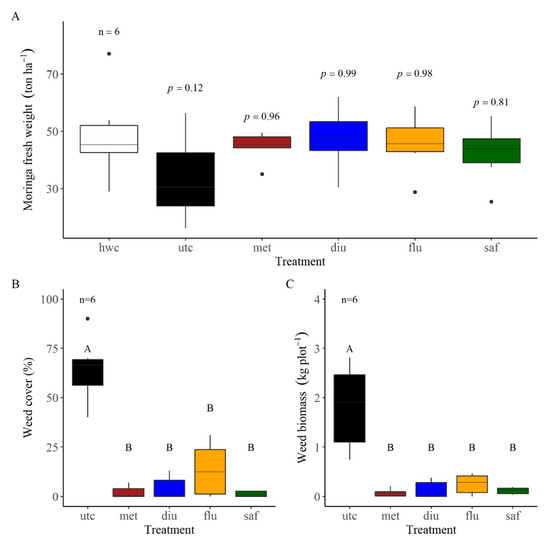 A statistical analysis was performed using a JMP ver. 15.0 software (SAS Institute Inc., Cary, NC, USA). Each experiment was analyzed separately. Moringa fresh weight and weed biomass were subjected to ANOVA. For moringa crop safety, means were compared to the hand weeded control using the Dunnet test (α = 0.05), and for weed control means were separated using the Tukey-HSD test (α = 0.05). For the POST experiments the average of each sample was transformed by the arcsin√x transformation (0 < x < 1), and re-transformed for graphic visualization [28]. Box plots described the results dispersion, median, max, and min data points, and Q1 and Q3 percentile. Data visualization was conducted using the ggplot2 R studio 4.0.3 package (Rstudio, PBC, Boston, MA, USA).
