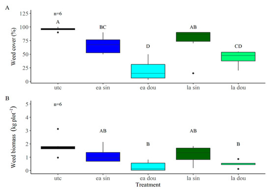 Effect of finger weeder treatments on weed control efficacy. (A) Weed cover and (B) biomass in the 2020 season. The treatments included: untreated control (utc), early single (ea sin), early double (ea dou), late single (la sin), and late double (la dou). Different letters indicate a significant difference between treatments according to the Tukey-HSD test (n = 6).