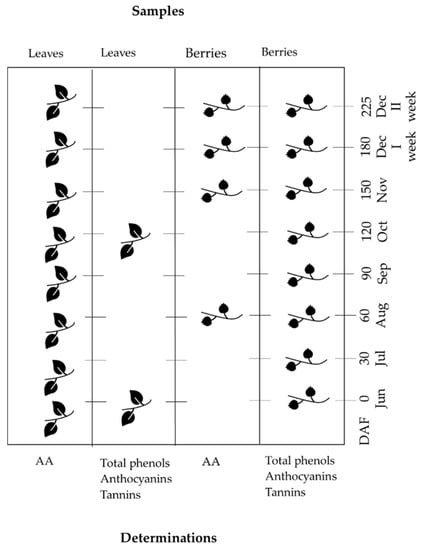 For the evaluation of antioxidant activity, the analyses were carried out at selected stages: for berries extracts at 60, 150, 210, and 225 DAF; 0 and 120 DAF for leaves extracts. Leaf’s sampling dates were chosen according to the completed development stage of the spring shoots (0 DAF) and autumnal maturity of the same shoots (120 DAF). Each chemical determination was carried out in triplicate.