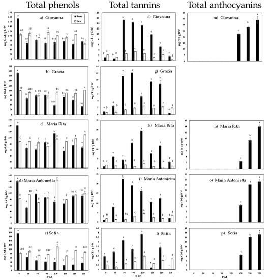 Berry total phenols content was higher during fruit set (0 DAF) than in ripe berry for all cultivars (Figure 2a–e). The following values were observed at 0 DAF: 173.92 mg GAE g−1 DW for ‘Giovanna’, 171.33 mg GAE g−1 DW for ‘Grazia’, 141.23 mg GAE g−1 DW for ‘Maria Rita’, 139.77 mg GAE g−1 DW for ‘Maria Antonietta’, and 145.53 mg GAE g−1 DW for ‘Sofia’. During berries development, the content of total phenols decreased, with differences among cultivars. The ‘Sofia’ cultivar showed the lowest content during 225 DAF with 35.45 mg GAE g−1 DW (Figure 2f). In the other cultivars, the minimum content was 63.91 mg GAE g−1 DW for ‘Giovanna’ at 210 DAF, 33.46 mg GAE g−1 DW for ‘Grazia’ at 225 DAF, 57.32 mg GAE g−1 DW for ‘Maria Rita’ at 150 DAF, and 52.89 GAE g−1 DW for ‘Maria Antonietta’ at 30 DAF.