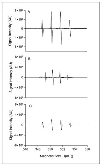 DMPO traps the hydroxyl radicals produced in the Fenton reaction and forms a DMPO-OH adduct, which has a four-line signal with the following hyperfine splitting constants aN = aH = 14.9 G (Figure 3). When the extract is present in the reaction mixture, the intensity of the DMPO-OH adduct’ signal decreases due to competition, for the hydroxyl radical, between the trapping agent and the antioxidants present in the extract (Figure 3).