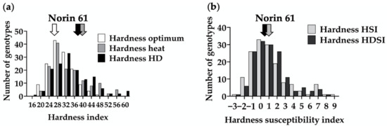 There was a clear association between having stable hardness and tolerance to heat or HD stress. The kernel weight HSI showed that 17 genotypes had a low kernel weight reduction, of which 12 had only a slight change in hardness, which remained stable or became softer (as shown in red color in Figure 2a). Based on HDSI, ten genotypes had a low kernel weight reduction, of which six had a low change in hardness (as shown in red color in Figure 2b).