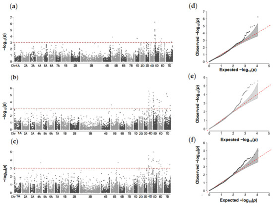 Manhattan for hardness (a) Under optimum environment, (b) Under heat environment, (c) Under combined heat-drought environment (HD), (d–f) Quantile–Quantile plots for hardness under optimum, heat, and HD.