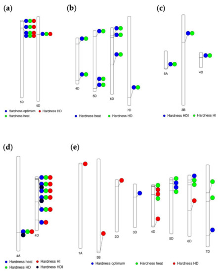 Significant marker trait associations (MTAs) for hardness that were (a) Stable MTAs under all conditions, (b) Significant markers associated with stress environment heat and HD, (c) Significant marker associated with hardness stress index HI and HDI, (d) Significant markers associated with stress condition for both hardness and hardness indexes (e) Significant markers associated with certain environment.