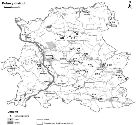 Location of sampling points in Puławy district (S1–S30) in Poland.