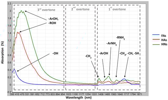 The visible region was characterized by a lower absorption (0.5%) for the FAs fraction and a higher absorption (2%) for the HNs fraction (data not presented). The HAs spectra were similar to that of the HNs, but had a slightly lower absorption (1.5%). Figure 2 presents the mean spectra (700–1880 nm) for each of the HS analyzed fractions. That range encompasses the first, second, and third overtones from the nearIR region. It is worth noticing that these overtones are slightly overlapping. Each presented spectra constituted the mean of the 30 samples of the isolated HS. The spectra were truncated at 1880 nm, due to the very high absorption of water in the later spectral range. This was already observed by other authors [,] for that kind of solution.