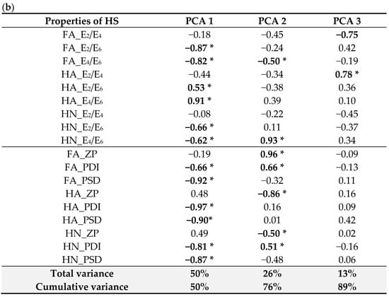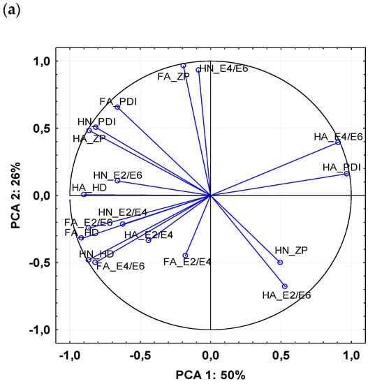The first three principal components explained 86% of the total variance of the results (Figure 3), whereas up to 76% of variance is explained by the first two factors. The first PCA component (PCA 1), which accounted for 50% of variance was significantly correlated with spectroscopic indexes such as E2/E6 (r = −0.87; r = 0.53; r = −0.66 for FAs, HAs, and HNs, respectively) and E4/E6 (r = −0.82; r = 0.91; r = −0.62 for FAs, HAs, and HNs, respectively) as well as electrochemical parameters such as PDI (r = −0.66; r = −0.97; r = −0.81 for FAs, HAs, and HNs, respectively) and HD (r = −0.92; r = −0.90; r = −0.87 for FAs, HAs, and HNs, respectively). The second PCA component (PCA 2), which represented merely 26% of data variance, was significantly correlated with E4/E6 ratio of FA (r = −0.50) and HN (r = 0.93) as well as ZP (r = 0.96, r = 0.86, r = −0.50 for FAs, HAs, and HNs, respectively) and PDI (r = 0.66, r = 0.51 for FAs and HNs, respectively) while the third component (PCA 3) was related with E2/E4 ratio observed for FA and HA.