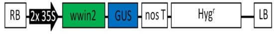 Schematic map of the pMDC140 T-DNA region after the integration of the wwin2 gene. RB: right border; 2× 35S: 35S promoter region of cauliflower mosaic virus; wwin2: wheatwin2 pathogenesis-related 4 gene; GUS: β-glucuronidase reporter, nos T: nopaline synthase terminator; Hygr: hygromycin resistant gene; LB: left border.