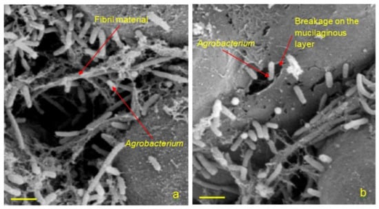 SEM imaging showed a clear fibril material formation produced by Agrobacterium on the surface of rice callus (Figure 2a). A formation of the mucilaginous layer resulting from an unsystematic proliferation in the growing callus that created a hole and exposed the inner cell to the outer environment was also clearly seen on the surface of the callus (Figure 2b).