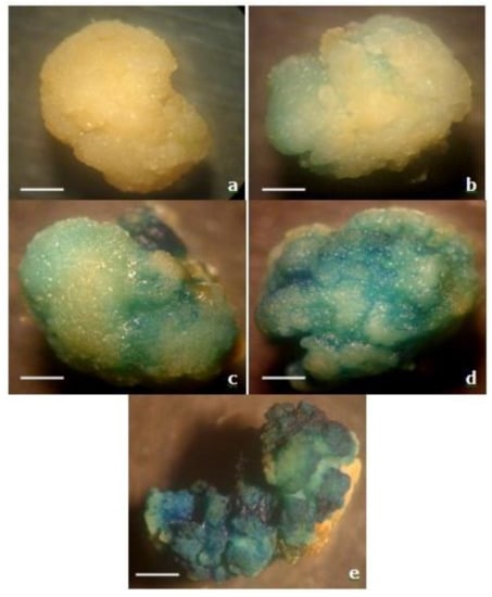 Transformed calli were soaked with 0.5 mL of GUS buffer (containing 1.0 mM of K3Fe(CN)6, 1.0 mM of K4Fe(CN)6, 50.0 mM of phosphate buffer (pH 7.2), 0.1% (v/v) of Triton-X 100, and 2.0 mM of X-Gluc) and incubated at 37 °C for up to 48 h. After that, the calli were immersed in 95% (v/v) ethanol for 24 h to remove the chlorophyll. Calli were observed under a stereomicroscope, and the intensity of the blue spot was scored according to recommendations []. Explant with more than 25% of blue spot coverage was recorded as transient GUS-positive. A non-transformed callus was used as a control.