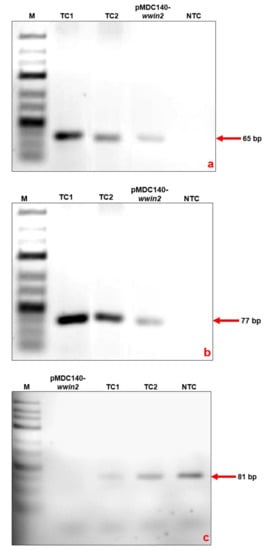 The presence of wwin2, hygromycin phosphotransferase II (hptII), and sucrose phosphate synthase (sps) genes were validated using RT-PCR. In brief, a master mix containing 100 ng of cDNA as template, 1X Taq Master Mix (Vivantis Technologies, Shah Alam, Malaysia), 3.0 mM of MgCl2, and 0.5 µM of primer sets targeting the genes (Table 1) was prepared with a final volume of 20 µL. The mixture was subjected to an initial denaturation at 94 °C for 2 min, followed by 35 cycles of denaturation at 94 °C for 2 s, annealing at 60 °C for 30 s, and elongation at 72 °C for 30 s, and a final elongation step at 72 °C for 5 min. The amplified products were electrophoresed in 3% agarose gel stained with ethidium bromide.