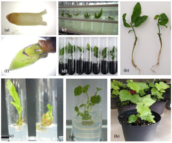 Plantlets, from embryonic axes cultivated in vitro, showed considerable rates of initiation and rooting rates in woody plant medium (WPM) [] supplemented with low concentration (0.4 µM) of N6-6-benzylaminopurine (BAP) and 15 µM of indole-3-butyric acid (IBA), which is in agreement with general consideration on superiority of WPM, BAP, and IBA on organogenesis and root formation (Figure 1b). Kinetin was not as effective for multiplication of shoots; however, it promoted the rapid elongation of apical shoots. Many buds sprouted on the initiation media without growth regulators, but the shoots did not elongate (Figure 1c) []. Phenol oxidation is another challenge in chestnut micropropagation in initiation stages. Mostly, it occurs with buds turning brown after a few minutes in a nutrient medium. Implementation of an ascorbic acid or polyvinylpyrrolidone (PVP) in the nutrient media did not prevent the browning. Nevertheless, the addition of 0.3% activated charcoal (AC) was effective in eliminating browning and acceleration of rooting (Figure 1d) []. Other our research was directed toward the long-term preservation of Castanea sativa, and reported the feasibility of in vitro embryonic axes when applying different cryogenic techniques such as dehydration, PVS2-vitrification, and encapsulation–vitrification followed by ‘one-step freezing’ in liquid nitrogen [,]. The valid protocol developed for the Georgian provenance of Castanea sativa can now be tested on a wide range of chestnut cultivars and hybrid clones to achieve the practical long-term cryopreservation of the Castanea genus germplasm. Hopefully, the work done on the Georgian provenance of Castanea sativa offers a useful platform for further studies toward the improvement of micropropagation strategies applied to the other threatened species of genus Castanea.
