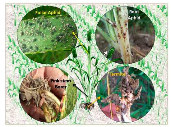 The major insect pests that are currently reported to attack wheat crops in north-western IGP include foliar aphids (Rhopalosiphum maidis (Fitch), Rhopalosiphum padi L., and Sitobion avenae (Fabricius)), termites (Microterme sobesi Holmgren and Odontoterme sobesus Rambur), pink stem borer (Sesamia inferens Walker), and root aphids (Rhopalosiphum rufiabdominalis Sasaki) (Figure 1). Amongst these, foliar aphids, R. maidis, and termites are regular and major pests of wheat in the north-western IGP region; however, pink stem borer and root aphids are emerging pests and have shifted from rice (Oryza sativa) to wheat [9,15,16]. The different insect pests, depending on their feeding behaviour and favourable edaphic conditions, appear at different stages of crop growth. The insect-pest damage is more evident in crop fields during the late-December to mid-February period (4 to 10 weeks after sowing) [11].