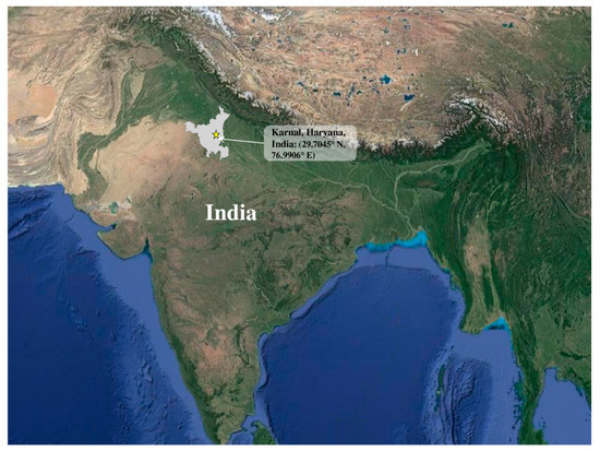 These studies were conducted at the research farm of the Indian Institute of Wheat and Barley Research, Karnal, India (GPS Coordinates: 29.7045°N, 76.9906°E) during 2016–2017 and 2017–2018 (Figure 2). The experimental soil was non-saline, slightly alkaline (pH 8.7) (digital multimeter for pH and EC, Eutech Instruments, Singapore; Model PC510), and deep alluvial silty-loam with low organic carbon content (3.9 g kg−1). The soils were reclaimed Typic Natrustalfs (USDA Soil Taxonomy), and contained 630 g kg−1 of sand, 333 g kg−1 of silt, and 37 g kg−1 of clay in the top 0–15 cm of the soil profile (hydrometer method). The soil had a steady-state infiltration rate of 3.0 mm h−1 (double-ring infiltrometer), Olsen’s extractable P-value of 18.9 kg ha−1 (using spectrophotometer, Analytic Jena, Jena, Germany), and ammonium acetate extractable K value of 157.8 kg ha−1 (using flame photometer, Systronic, Ahmedabad, India) in the top 0–0.15 m soil layer.