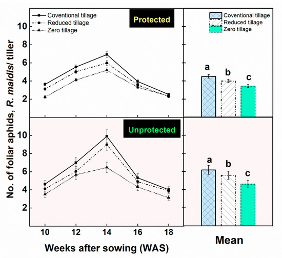 The population of foliar aphid varied significantly in three tillage systems (conventional, reduced, and zero) under both protected and unprotected conditions (Figure 3). Mean aphid number was significantly higher in the CT system (6.17 aphids/tiller) under unprotected conditions, followed by unprotected RT (5.58 aphids/tiller) and ZT conditions (4.49 aphids/tiller) (Figure 3). The aphid population trends were also similar in the three tillage systems during the different observation weeks from 10 to 18 weeks after sowing (WAS). The population range was recorded to be highest (4.02 to 9.91 aphids/tiller) under unprotected CT conditions during 10 to 18 WAS. A significantly lower number of aphids was recorded in insecticide-protected conditions as compared to unprotected conditions under the different tillage systems. Zero tillage (ZT) under protected conditions had a minimum population, with 3.36 to 5.19 aphids/tiller.