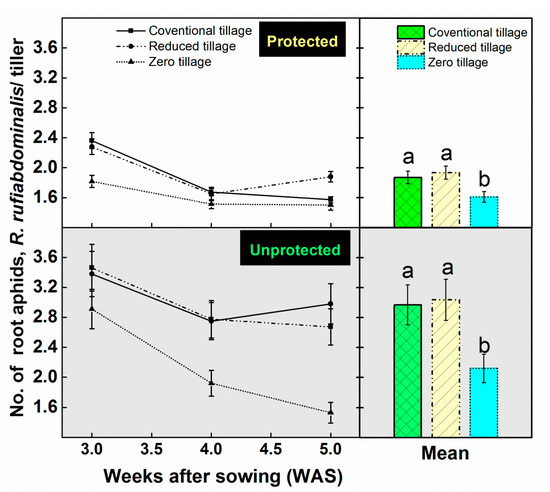 Type of tillage (F = 3.28; df = 2; p = 0.04), insecticide protection (F = 18.77; df = 1; p = 0.001), and their interactions (F = 1.21; df = 2; p = 0.03) had significant effects on the population of root aphids (Table 2).