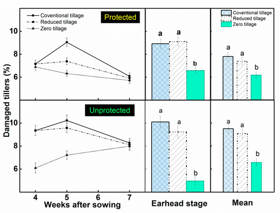 The trends were opposite for pink stem borer, with maximum damage in ZT followed by RT and CT. The controls were also highly effective for each type of tillage management (Figure 5). Unlike the other three insects, the activity of the pink stem borer increased with a reduction in tillage. Reduced soil disturbance in the presence of rice stubble provides an excellent ground for the proliferation of immature stages of the pink stem borer. A greater percentage of pink stem borer larvae have been reported to live below 4–5 inches (10.2–12.7 cm) depth of soil when the tillage in RT operations does not exceed 3 inches (7.62 cm). Therefore, insect larvae under RT can escape the brunt of rotary tillage operations [14,15].