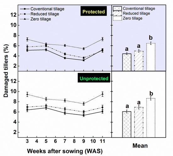 The data revealed significant effects from tillage on the root aphid (R. rufiabdominalis) population under both unprotected and protected conditions (Figure 4). Reduced tillage (RT) under unprotected conditions harboured the maximum mean number of root aphids (3.04 aphids/tiller), followed by CT (2.97 aphids/tiller) and ZT (2.12 aphids/tiller) under unprotected conditions. Under protected conditions, similar root aphid population trends were observed, with the mean number of aphids/tiller as 1.94, 1.87, and 1.69 in RT, CT, and ZT, respectively. The population of root aphids was observed only during the 3rd to 5th weeks after sowing, and later the population gradually declined and disappeared. The higher root aphid population numbers were observed during the 3rd week after sowing and were recorded to be 3.46, 3.38, and 2.91 aphids/tiller under unprotected CT, RT, and ZT conditions, respectively, compared to 2.36, 2.28, and 1.82 aphids/tiller under protected CT, RT, and ZT conditions, respectively. The population of root aphid was significantly higher in each tillage system under unprotected conditions compared to protected conditions during the sampled weeks (Figure 4).