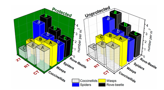 The populations of rove beetles and spiders were higher in ZT compared to other tested tillage systems. The population of rove beetles was 4.4 and 3.9 per m2 under unprotected and protected conditions in ZT, respectively. Similarly, the population of spiders was 4.00 and 3.5 per m2 under unprotected and protected conditions in ZT, respectively. It was noted that the overall population of each natural enemy group was higher in unprotected conditions compared to protected conditions. With increases in tillage, populations of coccinellids and wasps increased while populations of rove beetles and spiders decreased (Figure 7).