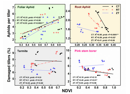 The relationship between the normalized vegetative index (NDVI) and insect population indicated that the aphid population was affected by crop vigour, but the population of termites and pink stem borer mostly remained unaffected. The foliar aphid population increased with an increase in NDVI, whereas the root aphid population decreased with increased NDVI under all tillage systems. The canopy temperature had very pronounced effects on all four insect pests, especially in CT (Figure 8). Although there was a decrease in the foliar aphid population with canopy temperature, the effects were significant in ZT only. On the other hand, there were significant increases in the root aphid, termite, and pink stem borer populations, but the effects were significant only in CT management. Besides changes in habitat via a change in soil condition, organic matter/residue on the soil surface, and other structural elements, the role of two key crop-related parameters, i.e., crop growth/vigour (as indicated by NDVI) and canopy temperature also seem to have controlled overpopulation dynamics of pests under different tillage regimes. An increase in NDVI favoured foliar aphid and disfavoured the root aphid population. These insects are the sap-sucker type and are therefore directly affected by crop vigour. The activity of root aphids lasts for a short period and subsides as crop growth intensifies, and perhaps therefore it is perhaps negatively related. Termites and pink stem borers have most of their activity near the soil surface and thus seem to be less affected by crop vigour (NDVI). Canopy temperature, on the other hand, had a pronounced effect. Increased canopy temperature decreased the activity and damage of insect pests that feed on crop foliage, i.e., foliar aphids, and increased the activity of those insect pests that operate in the root zone or on the soil surface. Increases in temperature appeared to favour the populations and damage of root aphids, termites, and pink stem borers that have their operating zones close to the soil surface and in surface residue, but more so in CT than ZT. It is well known that insects are sensitive to temperature, but the response can be multifaceted and ecologically complex depending on many other factors, including management [35]. These results point towards complexity of multiple interactions between the host (wheat crop) and the pests, and the microclimatic conditions that are experienced by the insects, unlike earlier studies that indicated a linear relationship of insect-pest development to air temperature [36].
