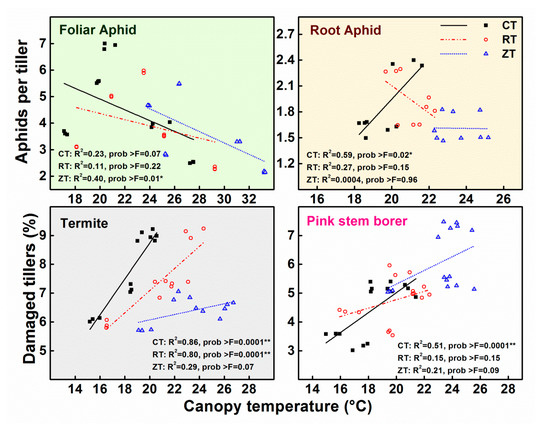 The canopy temperature had a significant positive correlation with aphid population under the protected ZT system (R2 = 0.40, p = 0.01) and with root aphid abundance under the protected CT system (R2 = 0.59, p = 0.02). Termite infestation also showed a positive correlation with canopy temperature under the protected CT (R2 = 0.86, p > 0.0001) and RT systems (R2 = 0.80, p > 0.0001). Only under the CT system, pink stem borer had a positive correlation with canopy temperature (R2 = 0.51, p > 0.0001) (Figure 9).