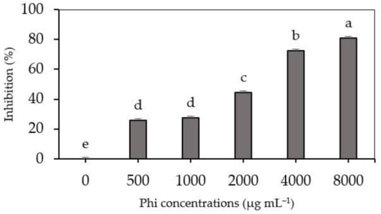 In this study, the evaluated concentrations (from 500 to 8000 µg mL−1 Phi) presented a fungistatic effect on the mycelial growth of the pathogen, with an inhibition range from 26.0 to 81.0% (Figure 1).