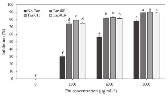 Mycelial growth inhibition (MGI) of Fusarium sp. with Trichoderma sp. (Taz-001, Taz-013, and Taz-016) and adding Phi to the culture medium. Means ± SD with different letters are statistically different (Fisher’s test; α = 0.05).