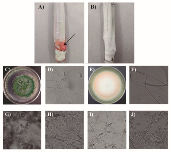 Base of the sugarcane culm exposed to the tested treatments and isolates of Trichoderma sp. and a Fusarium species complex from the roots of sugarcane plants to test the Koch’s postulates. (A) Presence of a red ring at the base of the culm in plants inoculated with Fusarium sp. on the root without fungicidal agents; (B) absence of red ring at the base of the culm in plants inoculated with Fusarium sp. on the root with any of the combinations of fungicidal agents (Trichoderma + Phi); (C) Trichoderma sp. colony in PDA; (D) Trichoderma sp. septate mycelium.; (E) Fusarium sp. colony in PDA; (F) Fusarium mycelium; (G) phialides in Trichoderma isolate; (H) Trichoderma spores; (I) Fusarium resistance structures; (J) Fusarium spores.