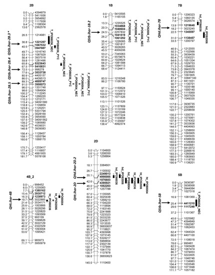 Two QTL for heading date QHd.ihar-2D.2 and QHd.ihar-7B were also detected in this study. Chromosome 2D is known to carry a photoperiod response gene—Ppd-D1 (34.0 Mbp)—which is considered to be the key locus determining the photoperiodic sensitivity of hexaploid wheat [78]. However, the physical location of QHd.ihar-2D.2 suggests that those are different loci, as the QTL is located at 629.3–642.4 Mbp. QHd.iahr-7B (6.8–10.9 Mbp) on chromosome 7B was mapped in close proximity to the region carrying the vernalization gene Vrn-B3 (12.0 Mbp) and the photoperiod response gene Ppd-B2 (26.8 Mbp).
