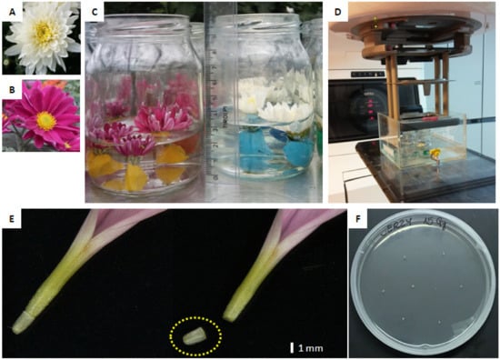 Inflorescences of the donor plants of chrysanthemums: (A) ‘Profesor Jerzy’ and (B) ‘Karolina’; (C) inflorescences prepared for irradiation with attached plastic clay loadings, immersed in water. Receptacles, where ovaries are located, were immersed approximately 2 cm deep. (D). Jars with inflorescences immersed in water in a polypropylene cubic container, just before high-energy electrons treatment. (E). Intact bottom part of ligulate floret of ‘Karolina’ (left) and after cutting off the ovary (right). (F). Ovaries placed onto Petri-dish directly after disinfection.