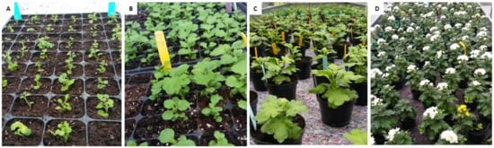 Cultivation of experimental ‘Profesor Jerzy’ plants in 2019. (A). Just after transplantation from in vitro culture. (B). After acclimatization. (C). Vegetative growth. (D). Flowering stage; among white inflorescences there are visible altered yellow ones.